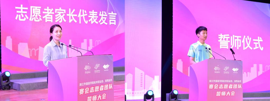 志愿者代表吴泽楷带领全体志愿者宣誓,要尽己所能,不计报酬,服务赛事,帮助他人,践行志愿精神,传播先进文化,为成功举办“两个亚运”贡献自己的一份力量。