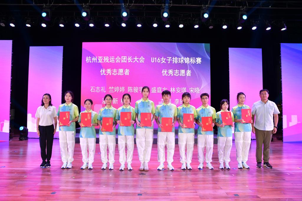 魏虹、李冰为在韵味杭州·综合测试赛、杭州亚残运会代表团团长大会和第一届亚洲U16女子排球锦标赛中表现优秀的志愿者颁发证书。