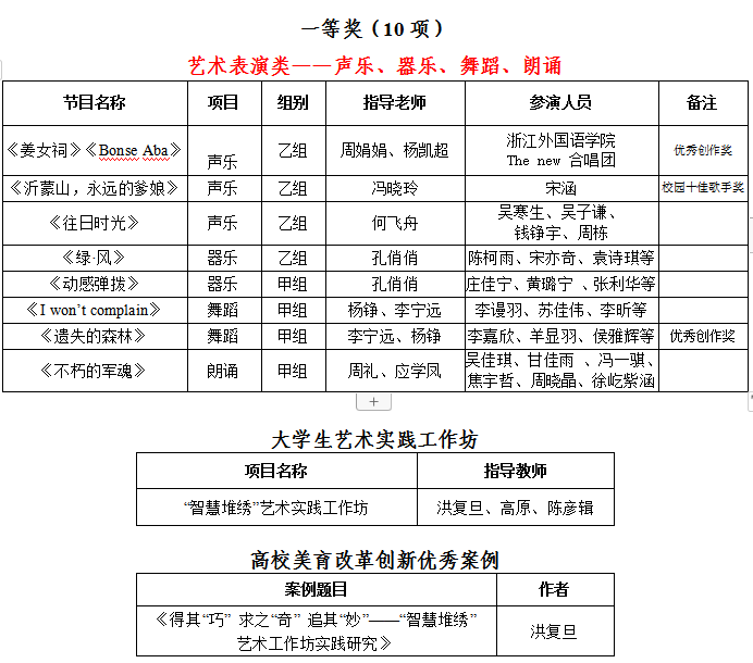 近日,2023年浙江省大学生艺术节在杭举办,集团斩获多项佳绩,选送作品获一等奖10项、二等奖5项、三等奖9项、校园十佳歌手1名、优秀创作奖2项,获奖等级和数量均创历史新高,并荣获“优秀组织奖”,取得我校在该项赛事的历史性突破。