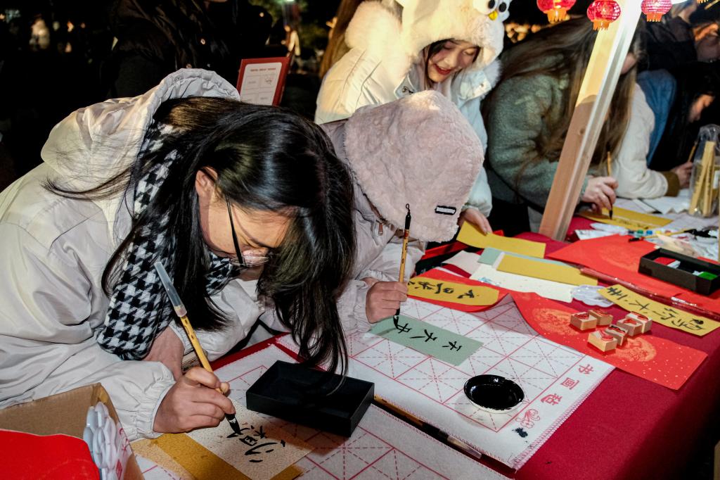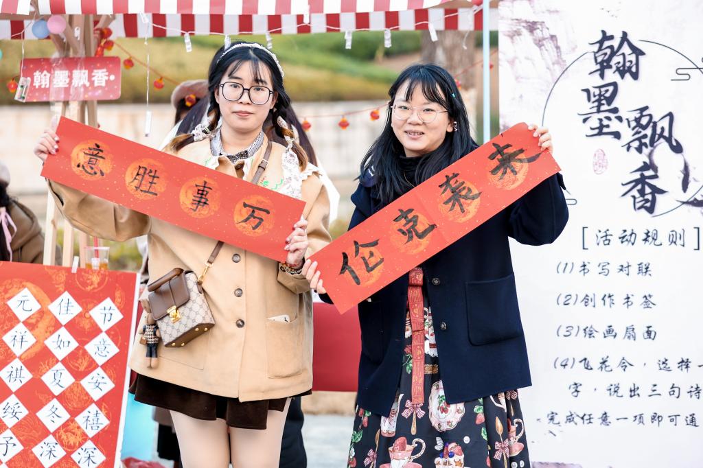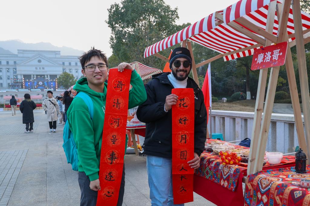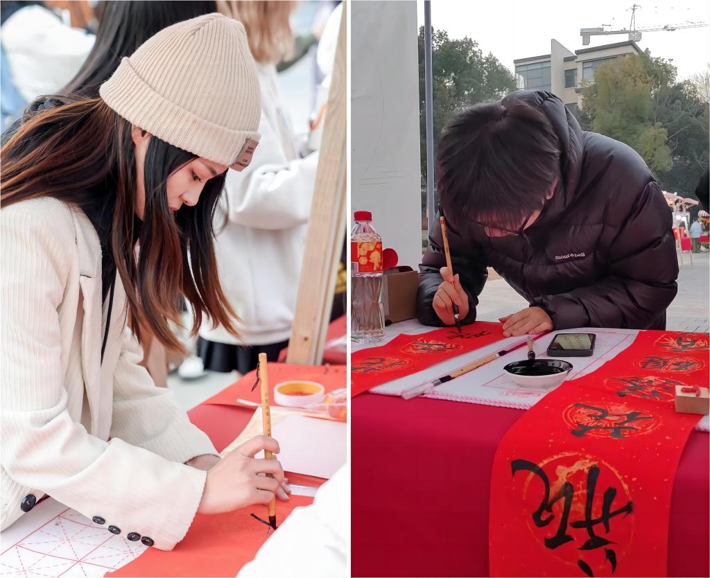 传统游园会上,“丹矢入壶”“足尖鸿羽”几个热门项目前面排起了长队,大家都迫不及待想要体验传统投壶、踢毽子等趣味游戏。几位俄罗斯留学生在“翰墨飘香”的队伍里提前拿出收集到的“福”字,认真临摹,迫不及待地想要感受中国传统书法的魅力。国际游园会区域人头攒动,师生们在各个展位前学习不同国家的日常用语,展位上留学生们用字正腔圆的中文“新年快乐”与大家打招呼,中外师生一起交流新年习俗,共盼美好未来。而乐艺集的展位上,每位“摊主”使出十八般武艺介绍自己的原创作品,有剪纸书画、文创产品、DIY手串等等,多姿多彩的传统民俗和丰富多元的国际文化汇聚,吸引着大家的眼球。