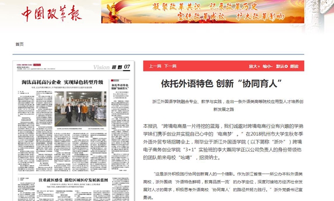 近日,《中国改革报》以“依托外语特色 创新‘协同育人’为题,报道了我校应用型人才培养创新发展之路。报道中提到,我校融合专业、教学与实践,走出了一条外语类高等院校应用型人才培养创新发展之路。