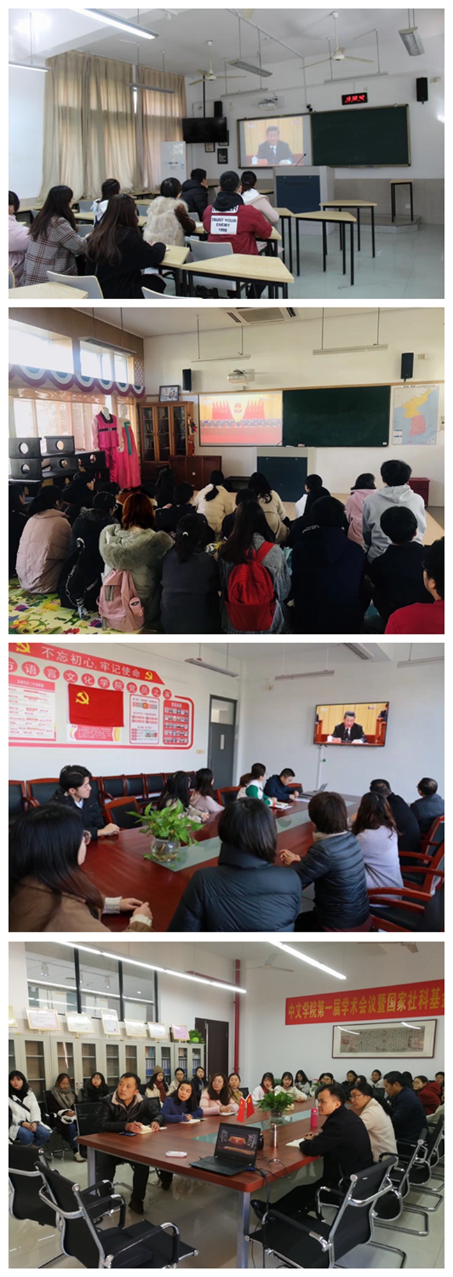 校党委书记宣勇谈到,改革开放是我们党的一次伟大觉醒,是中国人民和中华民族发展史上一次伟大革命。习近平总书记在庆祝改革开放40周年大会上的重要讲话令人鼓舞、催人奋进,闪烁着马克思主义的真理光辉,是我们深化改革开放的强大思想武器。在新时代,我们要高举习近平新时代中国特色社会主义思想伟大旗帜,深刻认识中国特色社会主义的伟大力量,深刻认识我们党做出改革开放战略决策的伟大意义,坚持用习近平新时代中国特色社会主义思想武装头脑、指导实践、推动工作;要进一步强化“四个意识”,坚定“四个自信”,坚决维护党中央权威和集中统一领导,坚持党委领导下的校长负责制,把党的领导贯彻和体现到办学治校全过程;要积极对接国家“一带一路”建设,服务开放强省战略,坚持内涵式发展,坚持提升教育品质,坚持深化综合改革,不忘初心,牢记使命,真抓实干,锐意进取,为全面建成外语特色鲜明、教育品质一流的国内知名应用型普通本科高校而不懈奋斗。