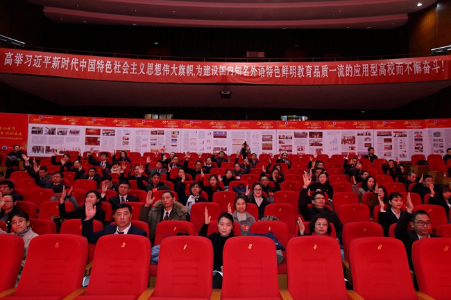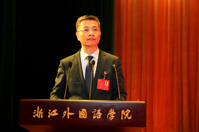大会号召,全校各级党组织、全体共产党员和师生员工,要以习近平新时代中国特色社会主义思想为指导,深入贯彻落实党的十九大精神,在浙江省委、省政府的正确领导和上级主管部门的大力支持下,主动对接“一带一路”建设,积极服务开放强省战略,奋力谱写新时代内涵式发展的新篇章,着力建设浙江省国际化人才培养的重点基地、服务浙江开放强省的智囊高地、浙江国际文化教育交流的重要阵地,在实现中华民族伟大复兴中国梦、推进浙江“两个高水平”建设的宏伟征程中充分体现集团担当、作出集团贡献、显示集团力量,为把学校建设成为国内知名外语特色鲜明教育品质一流的应用型高校而不懈奋斗。