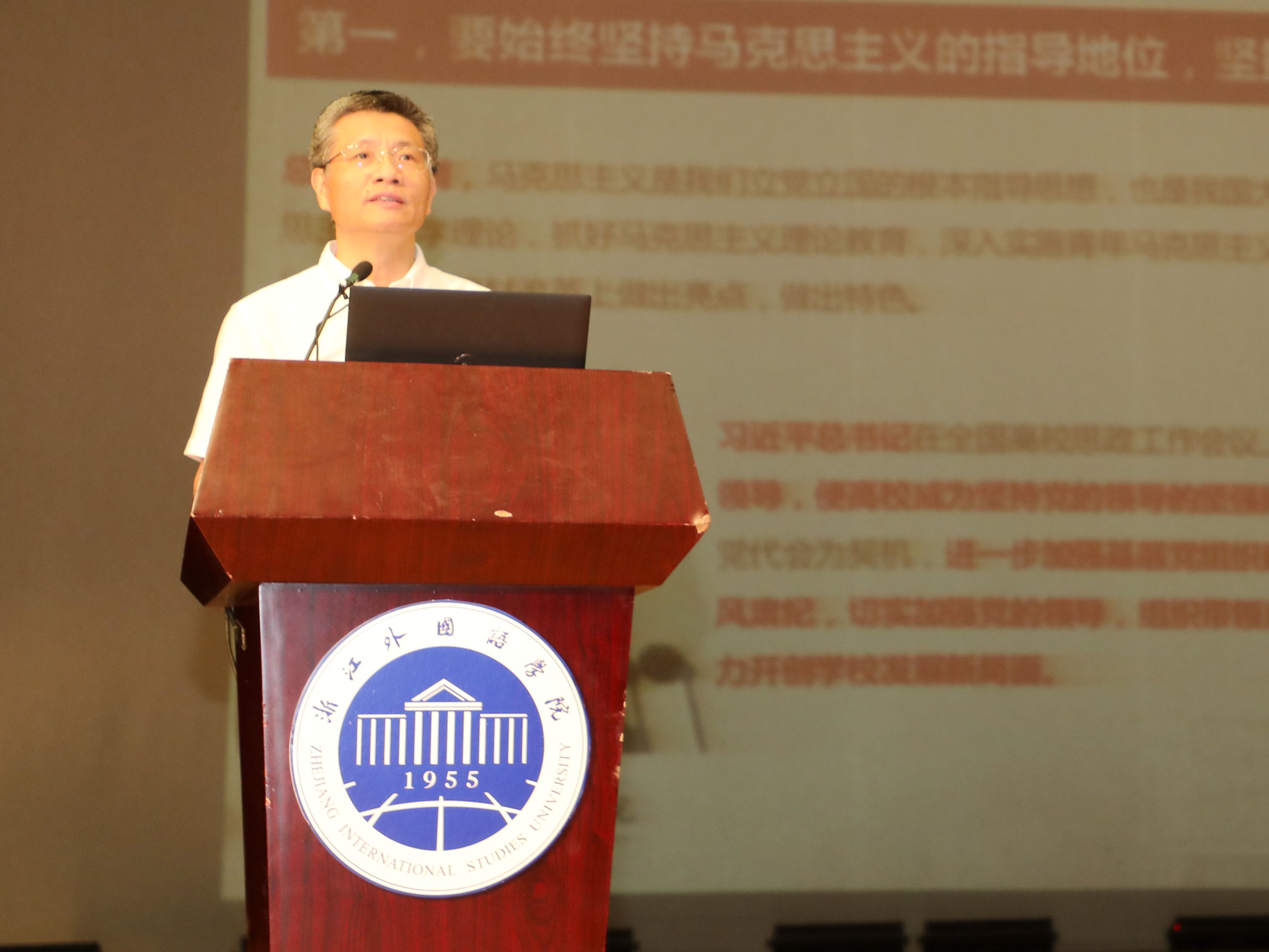 宣勇以习近平新时代中国特色社会主义思想为指导,围绕如何建设“外语特色鲜明 教育品质一流”的知名本科高校,向全体师生授课。他传达了总书记在北京大学师生座谈会、纪念马克思诞生200周年纪念大会上的重要讲话,紧紧围绕习近平总书记两次重要讲话精神的丰富内涵和精神实质,针对习近平总书记提出的“一个根本任务”“两个标准”“三项基础性工作”和“四个要求”,结合我校实际,从牢牢把握办学的正确政治方向,着力建设高素质的教师队伍,努力建设集团特色的人才培养体系和不断强化广大青年师生的责任担当四个方面谈了学习习近平总书记重要讲话的体会,并向全校师生提出要求,为学校下一阶段的工作指明了方向。
