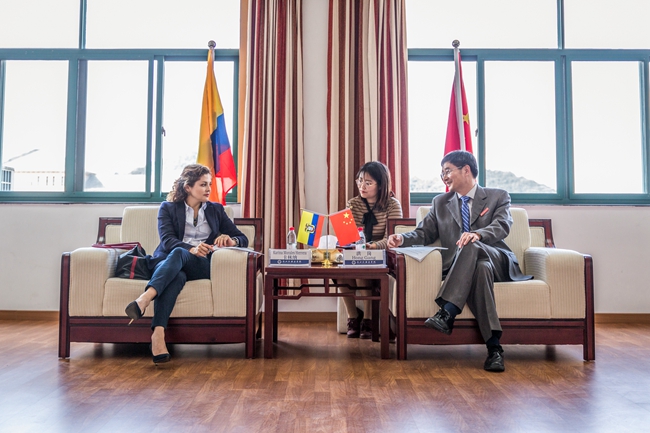 10月11日下午,厄瓜多尔驻上海领馆总领事卡林纳女士来校访问,并向我校图书馆赠送西班牙语书籍。校长洪岗出席会见并致辞。