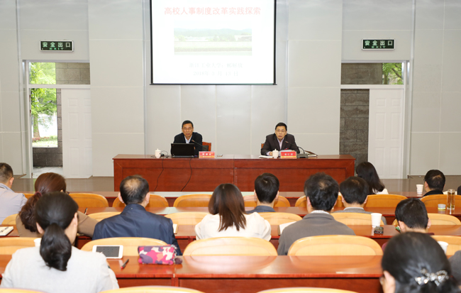 4月13日下午,浙江工业大学校长助理、人事处处长郦解放研究员和浙江农林大学发展战略管理处处长侯平教授应邀来我校分别作了题为《高校人事制度改革实践探索》和《基于战略导向的考核体系及考核办法》的专题讲座。讲座由副校长曹仁清主持。