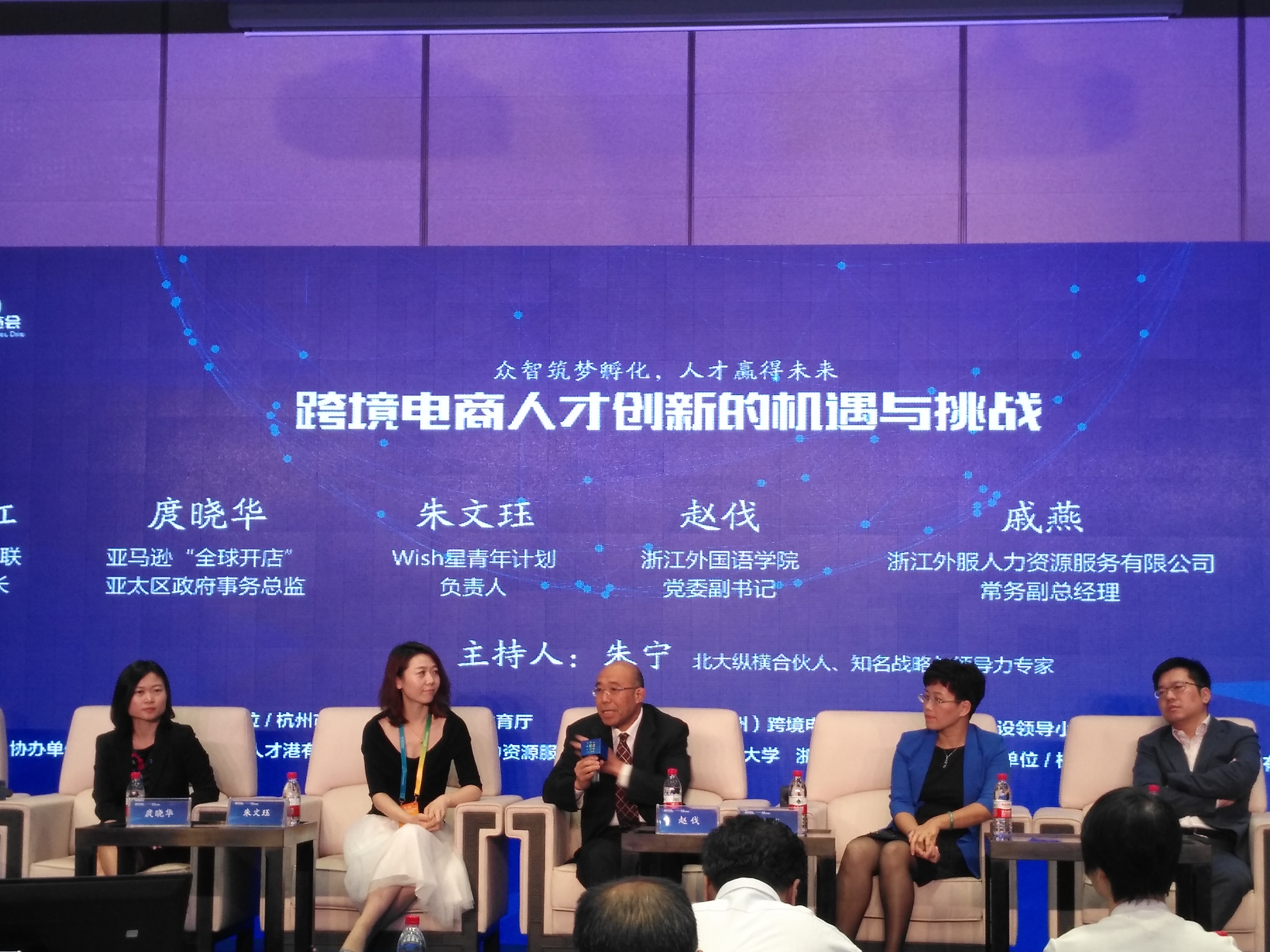10月26日,校党委副书记、跨境电商学院院长赵伐携创业学院一行参加了第四届中国(杭州)国际电子商务博览会,期间出席了潮起钱塘•第二届全球跨境电商峰会。赵伐作为高校代表与杭州跨境电子商务综合试验区、wish(中国)、亚马逊“全球开店”、浙江外服人力资源服务有限公司、四海商舟等政企代表在圆桌会议上就跨境电商人才培养等问题展开积极对话和深入讨论,并就下一步三方如何为社会输出优秀的跨境电商人才提出建设性意见。