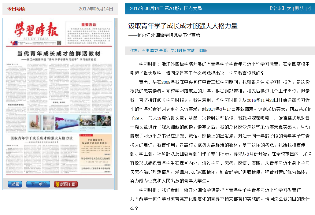 6月14日,中央党校主办的《学习时报》以“汲取青年学子成长成才的强大人格力量”为题,报道我校党委书记宣勇专访,全文长达3300余字。同时,学习时报网、《学习时报》官方公众号全文转载。专访着重报道了宣勇书记发起这项学习教育的设想、具体经验做法。宣书记向记者谈到,“青年学子学青年习近平”学习教育,是引领青年学子成长成才的重要抓手。学校党委一直思考如何将“两学一做”学习教育常态化,怎样能够学有成效,特别是让青年学子学有成效;一直思考怎样落实总书记在全国高校思想政治会议上的讲话精神,真正把立德树人工作贯彻在学生培养的全过程;一直思考怎样提高思想政治工作有效性,从我国长期的思想政治教育工作经验来看,树立榜样是最有效的方式。学校党政领导班子高度重视学习教育,以高度的政治责任感全面推开学习教育。注重加强组织领导,注重突出思想内涵,注重加强实践环节,着力营造浓厚氛围,并将抓好“青年学子学青年习近平”学习教育的持续和深化工作,争取取得更大成效。