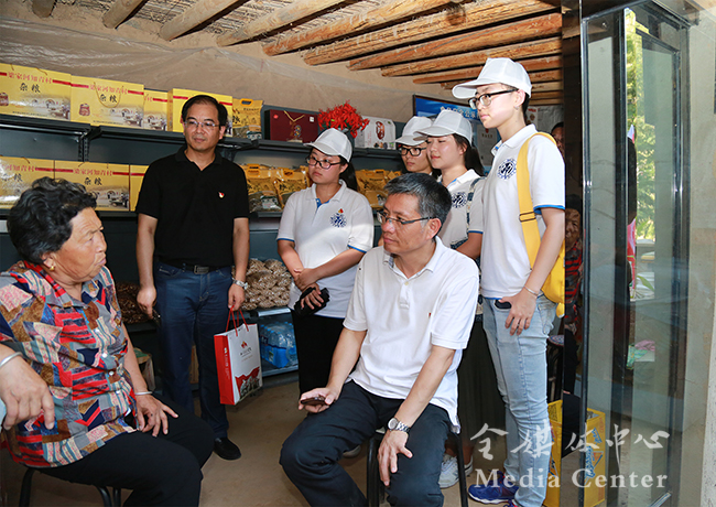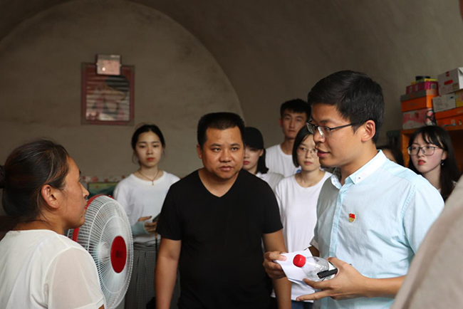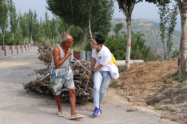 ——向村民发放药品。学生团队走进梁家河的村民中。纷纷向他们送上防暑药品,希望他们多多注意身体。“谢谢你们!”“欢迎你们来到梁家河!”“你们这次活动非常有意义!”……在发放药品期间,同学们和他们一起工作,一起聊天,收获了许多鼓励与肯定。