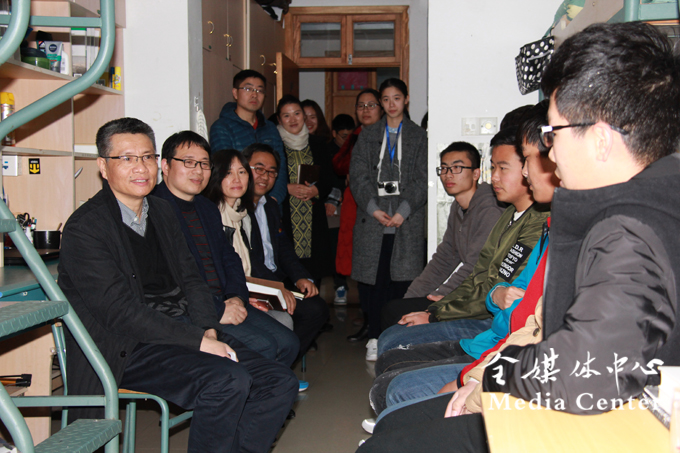 宣勇与同学们逐一交流,寝室里不时响起掌声和欢笑声。他强调,大学生们应该牢固树立矢志不渝的理想信念,在中华民族伟大复兴中国梦的实践中放飞青春梦想。宣勇还逐一详细询问了同学们今后的人生规划。学生李海洋分享道:“习近平积极为民的服务精神,告诉我们要深入群众,深入实际,我的规划是考基层公务员,以改变自己家乡为起点!”学生闻国金说:“习近平在知青岁月时,每天熬夜看书,我们学习语言的,就需要这种精神,从这个学期开始,我已经加入了晨读行动,虽然没有早课,我也要坚持每天早起读书,希望最后能够去实现自己环游世界的梦想!”……宣勇认真细致地倾听每位同学的成长规划,不时给出自己的建议和指导。他提议,寝室里要多组织集体活动,每位同学都要珍惜大学的美好生活。