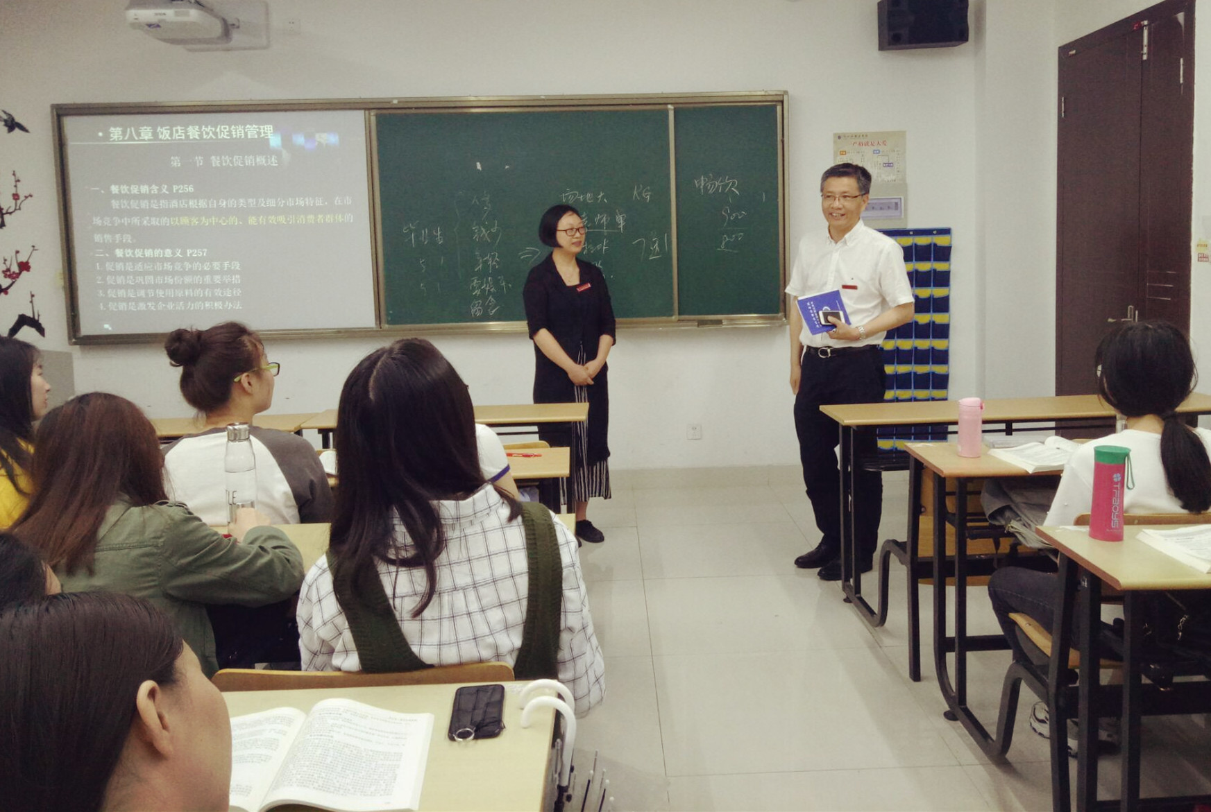 5月16日上午,校党委书记宣勇来到品院C414,与商学院2014级旅游管理1班的学生坐在一起,聆听旅游系李娜老师讲授《饭店餐饮管理》。