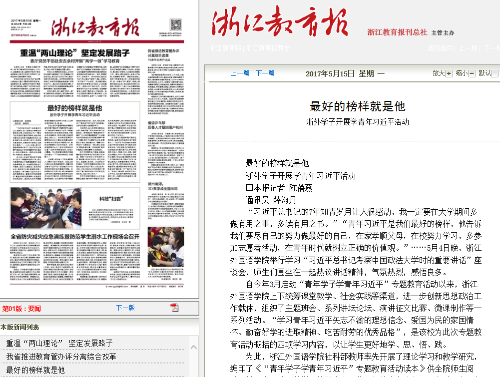 5月15日,《浙江教育报》头版要闻以“最好的榜样就是他”为题报道我校开展“青年学子学青年习近平”教育实践活动。