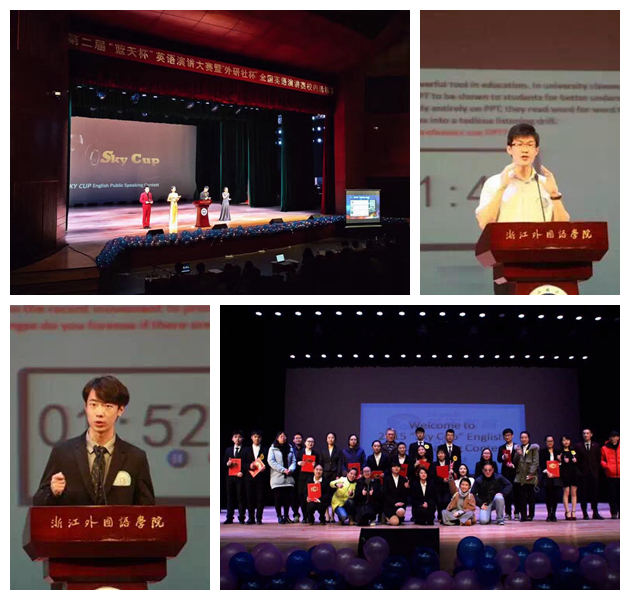 近年来,通过“蓝天杯”英语演讲比赛,我校挖掘了英语各方面的精英,将他们输送至更大更强的比赛现场,并赢得了诸多荣誉。第一届、第二届蓝天杯演讲比赛冠军袁园获2016年“外研社杯”全国英语演讲大赛浙江省赛区决赛一等奖,获“21世纪可口可乐杯”演讲比赛浙江赛区决赛获季军、一等奖,并代表浙江省参加全国决赛;潘姣姣在2016年“外研社杯”全国大学生英语演讲大赛全国总决赛获三等奖、2016年“外研社杯”全国大学生英语演讲大赛网络赛区获特等奖;乐熠琲获“21世纪可口可乐杯”演讲比赛浙江赛区决赛一等奖,2016年“外研社杯”全国大学生英语演讲大赛网络赛区二等奖,2016年“外研社杯”全国英语演讲大赛浙江省赛区决赛二等奖。郑磊在2016年“外研社杯”全国英语演讲大赛浙江省赛区决赛中获二等奖。