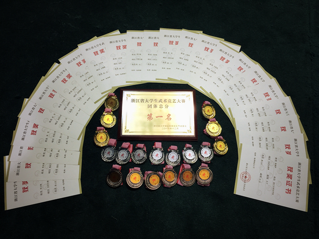 12月4日,浙江省第二届大学生武术竞艺大赛在杭州举行。我校大学生武术社团在吴炜和李志良两位老师的指导下,荣获团体总分第一名,共收获6金7银6铜的佳绩。