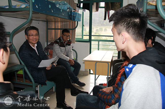 洪岗每到一个寝室,都就学习和生活方面的话题与同学们亲切交谈,详细询问大家来自哪个城市、饮食上是否适应、来到学校后有哪些不习惯、学习和生活上还存在哪些困难……还认真查看了寝室的各种设施。洪岗耐心地聆听同学们的述说,并要求相关职能部门和学院积极解决同学们提出的问题。当了解到大家来自于不同省份时,洪岗关切地询问他们对大学生活的适应情况,鼓励道: “寝室同学之间要相互学习、相互帮助,大家从天南地北来,相聚到集团这个大家庭一起学习不容易,要珍惜这样的缘分。同时要尽快完成从中学生到大学生的角色转换,奋发向上,在新学期里科学合理地安排学习和生活。”