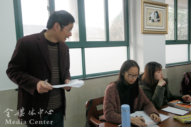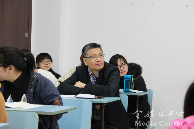 与此同时,洪岗来到望院B109,听取了英文学院李乐老师讲授的《综合英语》第一堂课。课堂中,李老师精神饱满,和学生们积极互动,大家一同徜徉在古希腊等经典文学世界。听到精彩处,洪岗频频点头,表示肯定。此外,洪岗还对照课表,对望院每个教室的上课情况进行了逐一巡查,了解师生的到勤、授课、课堂精神面貌等多方面情况。
