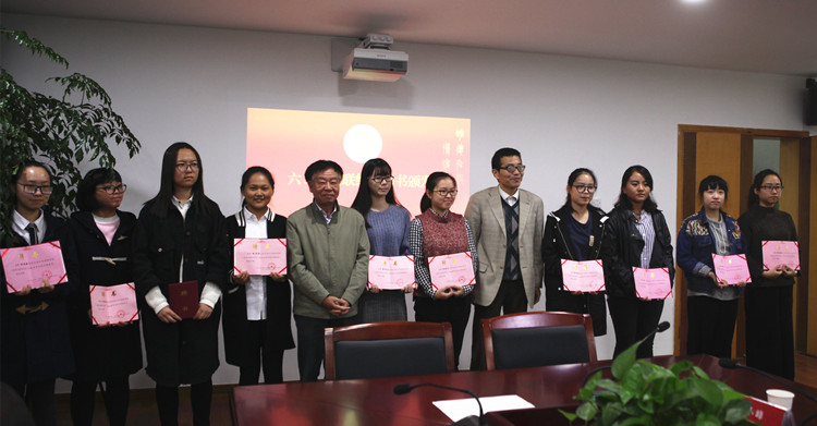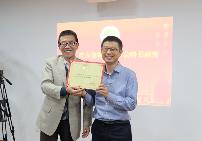 骆伯巍为部分校友颁发校友会常务理事聘书,为在校生校友联络员颁发聘书。