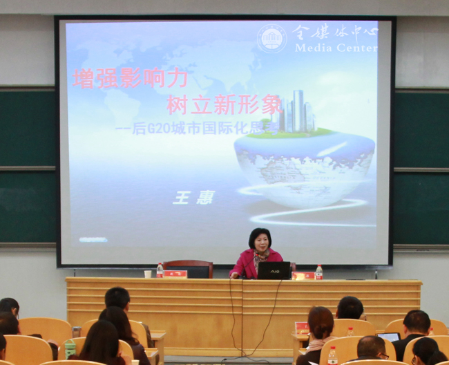 中外文化交流使者王惠以“增强影响力、树立新形象”为题,为大家带来了后G20时代城市国际化思考。作为大型国际文化活动资深策划人,G20杭州峰会的新闻顾问,2008北京奥组委新闻发言人和2022北京冬奥会组委会副秘书长,王惠结合自身丰富的中外文化交流工作经验,就提高国际影响力的紧迫性、走出去现状、走出去面临的挑战和问题等方面内容,以风趣幽默的语言、鲜活形象的例子进行了深刻分析。讲座思想起点层次高,观点内涵丰富,为我校推进国际化特色高校建设提供了创新工作方法的新思路。