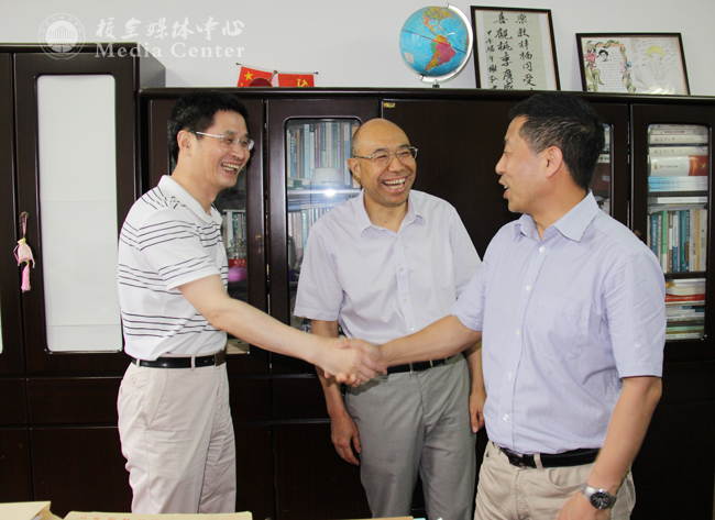 座谈会前,校长洪岗与李学忠会面交谈,进行了愉快地交流。