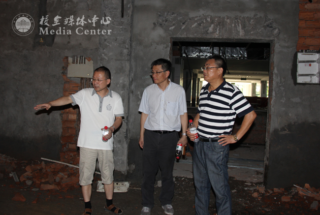 随后,宣勇又逐一仔细察看了正在拆建的原5号、6号教学楼以及学生寝室、学生食堂、变电站和校园主干道等拆建改建项目。宣勇与施工现场的同志一一握手,亲切慰问,向广大冒着高温酷暑一直奋战在施工一线的干部职工表示感谢。每到一处,宣勇都向有关负责人详细询问工程的施工情况、存在的困难和进展的预期,仔细听取汇报。在现场,宣勇还就有关问题和困难与大家进行探讨和商议,并当场提出了解决的思路和办法。宣勇指出,在建多个项目面临任务重困难多工期紧等多重难题,学校将积极整合各方力量,协同配合,大家共同努力,在保证质量、安全施工的前提下,务必在新学期开学前完成食堂、宿舍等相关项目的改造。在考察食堂改造项目时,宣勇还嘱咐学校有关部门负责人,食堂改造除了要满足学生群体日益增长的多元需求外,更要着重考虑食堂要体现我校集合多语种教学的校园文化特点,体现国际化办学特征,让食堂文化与学校教学文化一样成为富有集团特色的一道亮丽风景线。