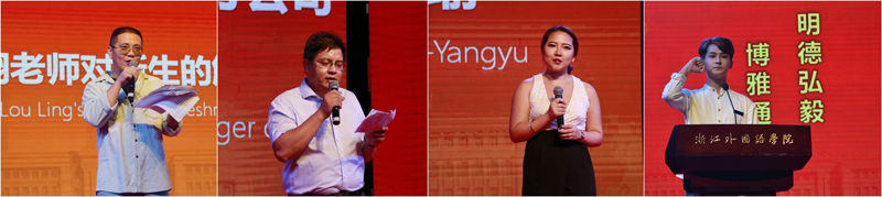 典礼进入第二篇章。英文学院教师楼翎作为教师代表发言,以流利优美的美式英语向新生们介绍了自己的英语学习经历,告诉大家英语是一个万花筒,从这个万花筒里可以发现一个新奇的世界;义乌商贸城总经理骆建军作为校企合作单位代表发言,表达了对我校学生创业创新的大力支持之情;西语学院2013级意大利语专业学生杨瑜作为老生代表,向新同学们介绍了自己学习与创业的经历,欢迎有更多的同学加入到创业创新的队伍中来。新生代表程瑜赟作为本环节的客串主持,与发言嘉宾进行了互动采访,一首“集团青年”诗朗诵掷地有声地表达了集团新生们的自豪与梦想。