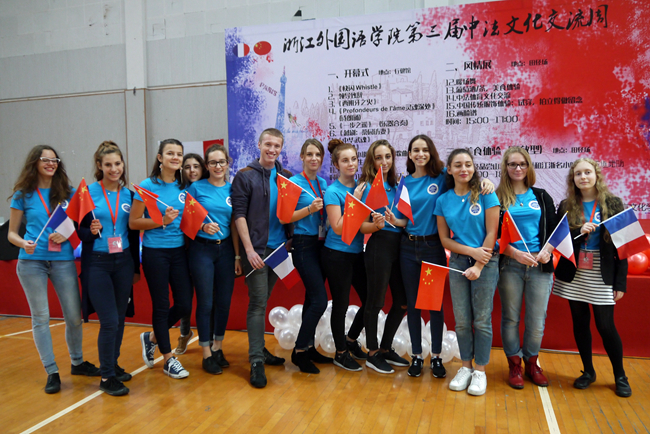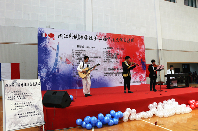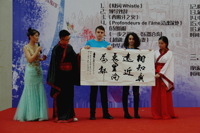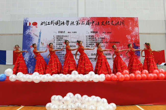 随后,一曲《快闪Whistle》,激情四射,动感十足,赢得了观众的阵阵掌声,正式拉开第三届中法文化交流周的帷幕。中法双方学生都表演了精彩绝伦的节目,中法文诗歌朗诵配书法表演《灵魂深处》、乐器合奏《一步之遥》、越剧《桑园访妻》、武术表演《中华武魂》、汉服舞蹈《故梦》等,我校学生带来的异彩纷呈的节目让法国学生领略了中华文化的无穷魅力。