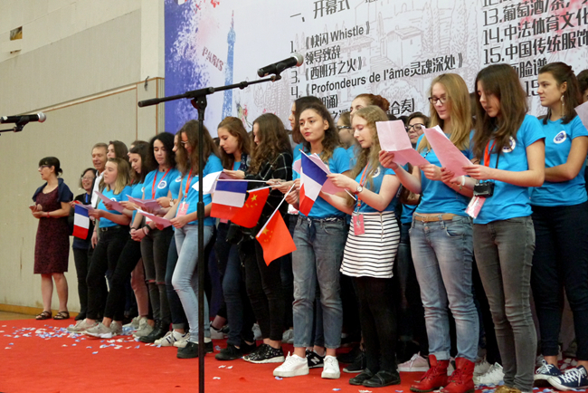 法国学生代表演唱了精心准备的合唱曲目《Santiano》《Les Champs élysées》等法国著名歌曲,法国学生Emma Marie Ngawong还领唱了歌曲《love on top》《Cup Song》以及福音音乐《This is the Day》。轻快的歌声,将全场气氛引向高潮。