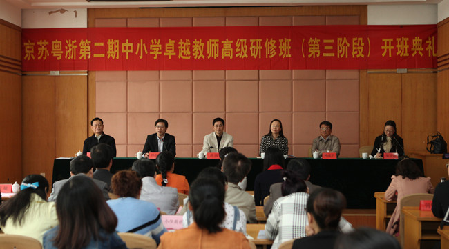 4月18日上午,京苏粤浙第二期东部卓越教师高级研修项目(浙江阶段)在我校开班。来自北京、江苏、广东、浙江四个省市的136名小学英语、语文、数学骨干教师,将在我校参加第三阶段,为期一周的培训。校长洪岗,省教育厅师范处处长庄华洁,北京教育学院副院长钟祖荣、江苏第二师范学院常务副院长周成平、广东省第二师范学院基础教育研究中心主任吴惟粤出席了开班仪式。