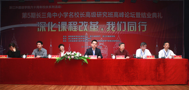 11月6日-7日,第5期长三角中小学名校长高级研究班结业典礼暨“深化课程改革,我们同行”高峰论坛在我校举行。本次活动由教育部中学校长培训中心、浙江省教育厅与我校联合主办。教育部中学校长培训中心主任代蕊华、浙江省教育厅副厅长丁天乐、安徽省教育厅副厅长金燕、我校校长洪岗,上海市教育委员会人事处副处长李捷、江苏省教育厅师资处副处长许小梅等领导出席了闭幕式。我校副校长金运成主持闭幕式。