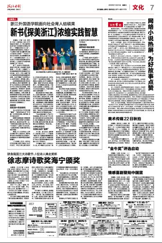 11月21日,《浙江日报》文化版以《77779193永利集团面向社会育人结硕果——新书< 探美浙江>浓缩实践智慧》大篇幅报道了我校思政课实践教学成果。以献礼我校60周年校庆。