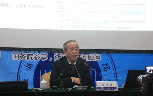 接着,施祖麟剖析了浙江省经济发展现状与机遇。他指出浙江经济发展的优势所在,如浙江经济虽然增速有所放缓,但是仍高于全国平均水平;浙江经济在全国地位不断提升,城市化发展成效显著;产业结构不断优化,第三产业比重不断上升;宁波-舟山港成为世界第一大港;以互联网为核心的信息经济发展迅速等。但同时他也道出了浙江经济发展中存在如服务业质量有待进一步提升、产业投入产出效率不高、高新技术产品比重不高、工业结构下行压力不断加大、创新质量待提升等短板的问题。