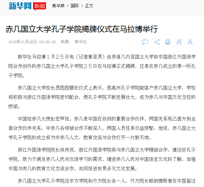 1月26日,新华网以《赤几国立大学孔子学院揭牌仪式在马拉博举行》为题对我校与赤几国立大学合作创办的首个赤几孔子学院正式揭牌进行了专题报道。新华社记者还对出席揭牌仪式的中国驻赤几大使赵宏声、我校校长洪岗、赤几国立大学校长恩图图穆,进行了现场采访。