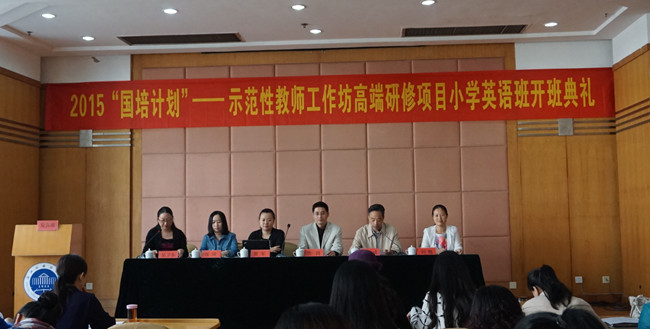 10月13日上午,2015国培计划——示范性教师工作坊高端研修项目小学英语班在我校开班。该项目由我校与英国大使馆文化教育处、中国教师研修网联合举办。项目首席专家、校长洪岗,副校长金运成,研修网副总编贺军、远程执行负责人张欣参加了开班典礼。 据悉,英国大使馆将选派英国专家进行为期5天的嵌入式培训,旨在通过对江苏、福建、山东、山西、湖北、贵州和辽宁等7省的24名高校英语教师、小学教研员以及优秀小学教师集中面授,以带动7省2400多名小学英语教师教育教学能力的提高。