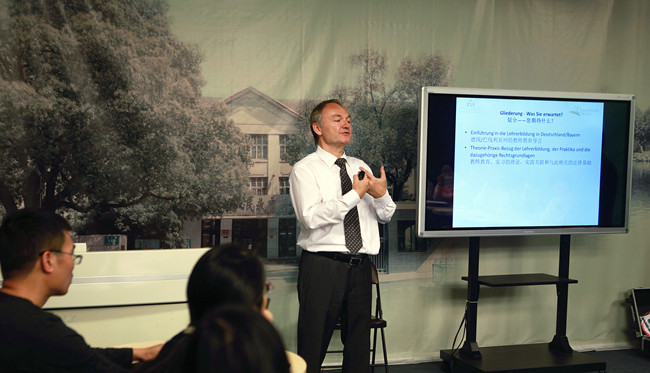 曹仁清代表学校向来自全省师范院校及我校师范生培养院系的43位参训学员表示了热烈欢迎,对德国帕绍大学的福克斯教授来我校讲学表示感谢。李敏强介绍了此次培训班的背景与意义。雷诺介绍了基金会中德合作项目的历史与近况。
