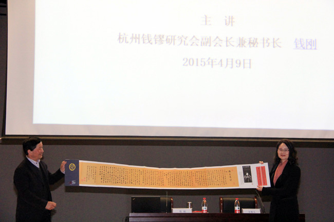 报告会上,钱刚首先列举了钱陈群、钱大昕、钱钟书、钱学森等古今钱氏名人,并指出钱姓作为百家姓中排位第90的“小”姓,却能涌现出如此多的各界名流与钱氏祖先和钱氏家训有着密不可分的关系。钱镠,钱姓祖先,是五代十国时期吴越国的创建者,在位期间以“善事中国 保境安民”为基本国策,修筑捍海石塘、治理太湖,开凿灌溉渠道,疏浚西湖,建设苏州、杭州城,开拓了“上有天堂,下有苏杭”的美景。同时,钱镠也为后世留下了珍贵的精神遗产,其家教、家训、遗训,成为独特的钱氏家族文化和吴越文化。