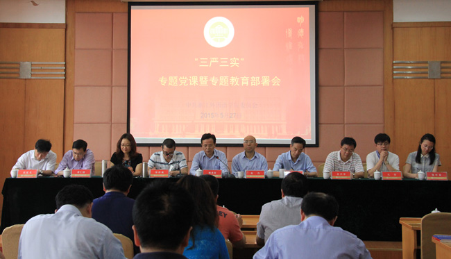 根据中央和省委开展“三严三实”专题教育部署要求,5月27日,学校举行“三严三实”专题党课暨专题教育部署会,正式启动“三严三实”专题教育。校党委书记姚成荣为学校中层以上党员干部讲专题党课,对专题教育进行动员。校党委副书记骆伯巍主持会议并作具体部署。学校党政领导班子成员,全体处级领导干部参加会议。