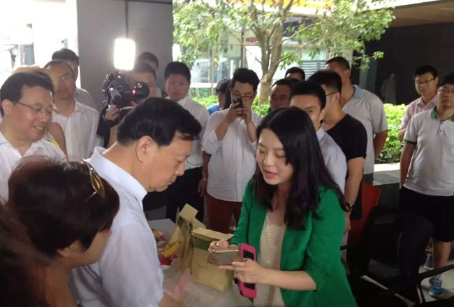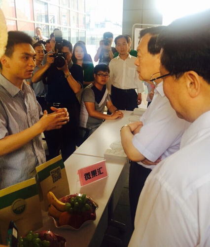 “微果汇是做什么的?”“你们是个性定制?”穿过层层人群,省委书记夏宝龙来到了“微果汇”面前并表现出很大的兴趣,与微果汇CEO曲春旭以及物流主管郑洪华进行了亲切交谈。夏宝龙就“微果汇”团队经营项目的个性定制和营销方案问询了团队的两位核心成员。曲春旭与同伴仔细地回答夏书记的问题,描述自己的产品,这番光景引爆了现场的闪光灯。