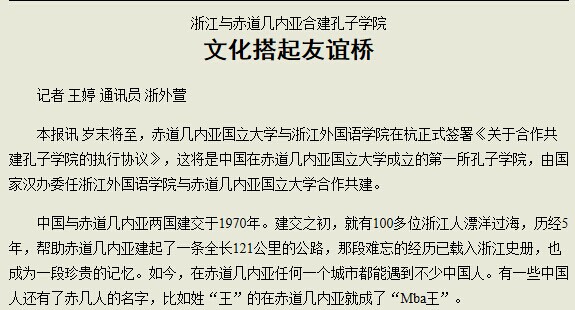 12月9日,《浙江日报》人文版以“文化搭起友谊桥”为题,深度报道了我校与赤道几内亚国立大学正式签署《关于合作共建孔子学院的执行协议》相关事宜。同时,浙江新闻手机客户端头条栏目首条推送。人民网、网易等社会媒体进行了转载。