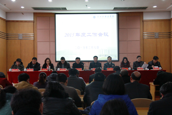 3月6日,学校召开2015年度工作会议。姚成荣、洪岗、骆伯巍、金运成、郑亚莉、陆爱华、赵庆荣、曹仁清、沈钢、章建生等校领导班子成员,近期退下来的校级领导,中层干部、正高级专业技术人员、民主党派主要负责人、教代会执委会、工会委员会成员和部分党代表参加了会议。党委书记姚成荣主持会议。