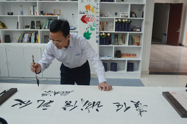 在柏舟文化交流厅,姚成荣详细询问了项目情况,并亲笔题词“责任 诚信 礼仪”,勉励创业团队和全校同学有责任、讲诚信、守礼仪,“知行合一,文化养人,诚信育人”。