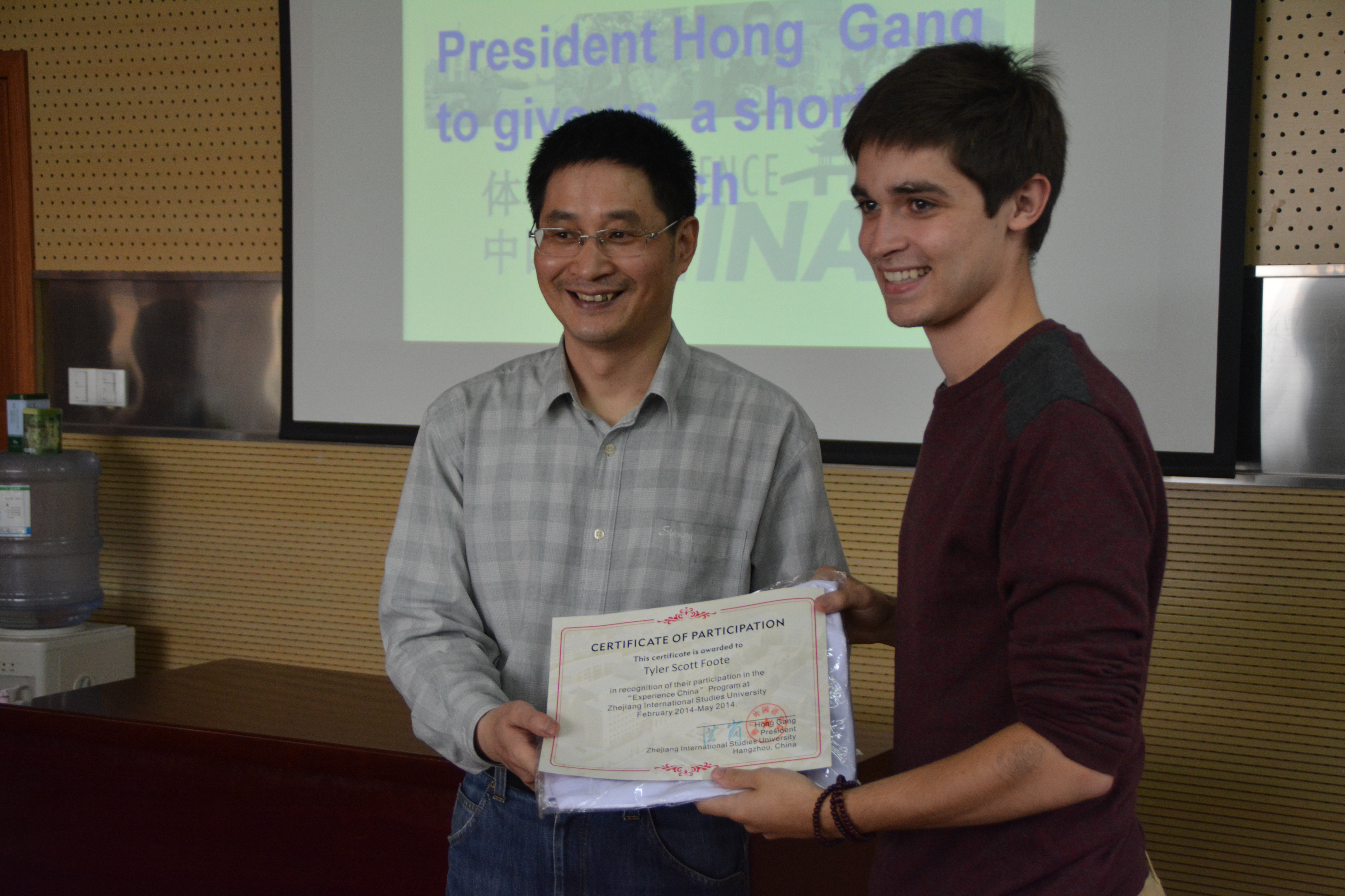 近日,第三期“体验中国”项目在校本部举行结业仪式。 结业仪式上,院长洪岗为项目学员颁发了结业证书,代表学校祝贺美国学生顺利完成学习项目。洪岗说,虽然中美文化和语言存在差异,但是美国同学以一种积极开放的心态和团队合作的精神,感受中国的风土人情,让自己融入到中国文化中,这是一种真正意义上的体验。 美国学生以展示照片的方式,与我校师生分享了在中国学习与生活的精彩瞬间。