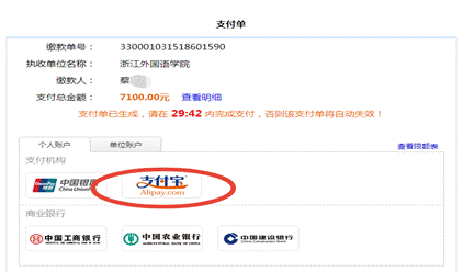 勾选需要缴费的项目,一共有两个收费项(学费、住宿费)。注意有往年欠费的情况,需要一年一年单独勾选缴费,不能将好几年的欠费全部勾选一次性缴费。核对缴费项目和金额,点支付宝扫码完成缴费。