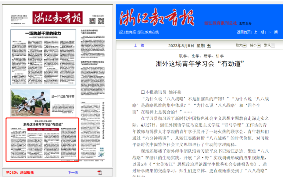 《浙江教育报》头版报道青年学习小组开展学习会情况。